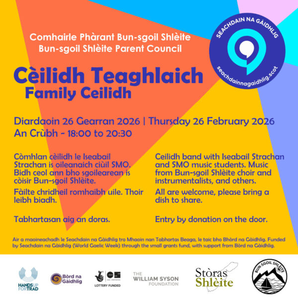 Còmhlan cèilidh le Iseabail Strachan is oileanaich ciuil SMO. Bidh ceol ann bho sgoilearean is coisir Bun-sgoil Shleite.